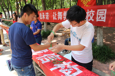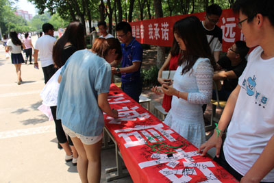 活动现场,广大同学积极响应号召,纷纷在“让舞弊远离校园,让诚信常驻心中”、“以实力验证自我,以诚信构筑人生”的倡议条幅上签名,承诺在期末考试中诚信考试,杜绝舞弊行为。部分老师也参与了签名承诺活动。志愿者为参与签名的老师、学生系上绿丝带以表承诺与纪念。