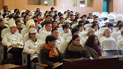 11月27日下午,后勤服务中心联合黄岛区卫生监督所及黄岛区卫生协会对我院公共场所从业人员进行了卫生知识培训。学院图书馆、餐厅、大学生活动中心、浴室、理发店、物业等部门100余名从业人员参加了培训。