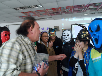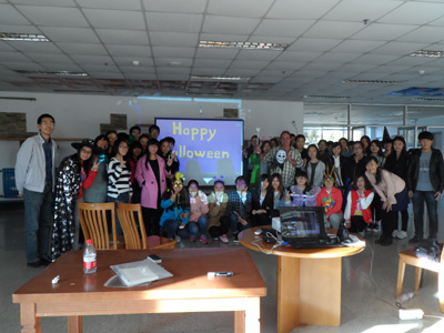 在欣赏完关于万圣节简介的flash动画和万圣节音乐的短片之后,赴美国执教3年的公共教学部尹衍杰老师为同学们展示了他所居住的社区庆祝万圣节的照片并作相关介绍;澳大利亚外籍教师Ben从万圣节的起源讲起,就中西方重大节日与同学们进行了交流。随后,同学们穿上化妆服,戴上面具,在与外教的互动中体验了万圣节独特的“Trick or treat ”(“不请吃就捣蛋”)风俗。在轻松活泼的氛围中,同学们了解了西方文化风俗,锻炼了英语口语。