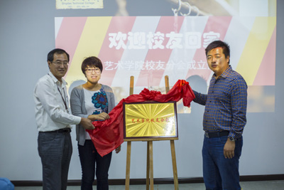 新当选校友分会会长范新法与艺术学院院长乔璐、党总支书记李志强共同为校友分会揭牌