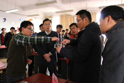 活动过程中,获奖同学依次向前来参观的领导和嘉宾介绍并演示作品,各位领导认真与每位获奖选手进行交流,并就作品的创新性、实用性、商品化等因素向同学们提出了指导性的建议和意见。