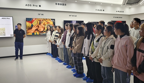 在青岛京东方光电科技有限公司,学生们在企业导师的带领下,参观了京东方产品展示中心及生产线,详细了解了企业的发展历程、产品研发和技术创新等方面的信息。在展示中心,学生们亲身体验了京东方最新研发的智慧医工、裸眼3D、8K超清屏等产品,感受到了“智能智造”带来的便捷与震撼。在生产线上,学生们观看了全自动模组产品线的生产过程,详细了解了各类智慧物联应用场景,对企业产品的生产工艺和质量控制有了更加深入地了解。