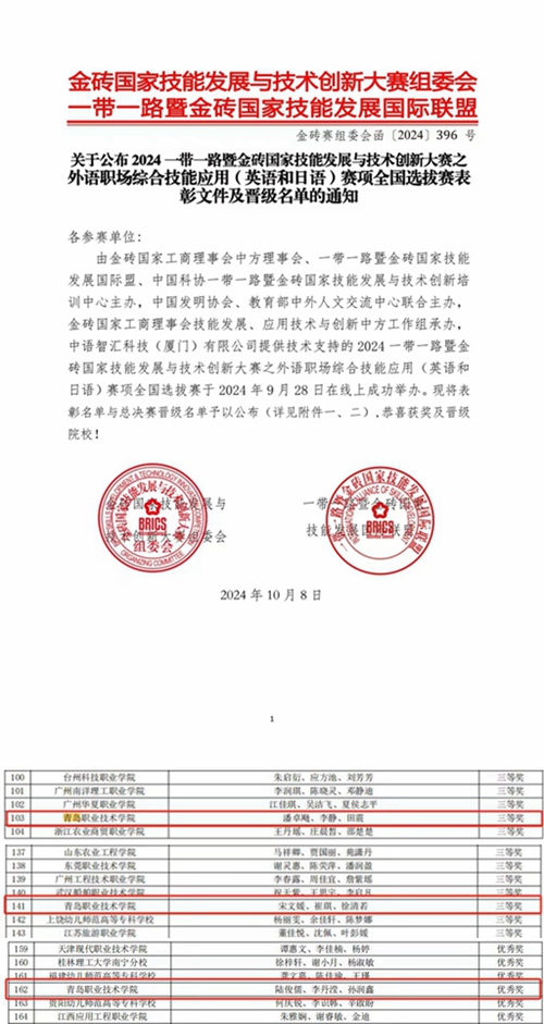 10月13日,2024年一带一路暨金砖国家技能发展与技术创新大赛“外语职场综合技能应用(英语)”赛项公布了全国选拔赛获奖名单,米兰MILAN(中国)选派的三支代表队获得比赛三等奖2项、优秀奖1项。