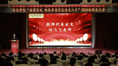 大会在庄严的国歌中拉开序幕,播放了2024级新生开学及军训视频。信息学院与会领导、教师上台依次进行发言,介绍分管工作内容、专业情况及能为新生提供的服务并寄语新生。随后,云计算技术应用专业2024级2班学生郑子豪带来了歌曲《不忘初心》,赢得了现场观众的阵阵掌声。优秀教师代表孙飞飞博士从“顺应发展,持续学习”“培养创新思维,敢于实践”“注重职业道德,培养社会责任感”“保持身心健康,珍惜大学生活”四个方面,引导学生心怀国家、勇担强国使命,传承匠心、争做技能先锋。