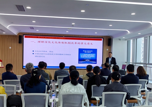 学习培训会上,胡岳潭以“坚定文化自信 深化文化体制机制改革 激发文化创新创造活力”为题,从“是什么”“为什么”“怎么做”三个维度,就理解深化文化体制机制改革的重大意义、把握深化文化体制机制改革的基本要求、明确深化文化体制机制改革的现实路径等方面内容,进行了全面深入阐释。并结合完善意识形态工作责任制、优化文化服务和文化产品供给机制、健全网络综合治理体系、构建更有效力的国际传播体系等方面的改革举措,围绕增强文化自信、培育形成规模宏大的优秀文化人才队伍、激发全民族文化创新创造活力等方面进行了详细解读。