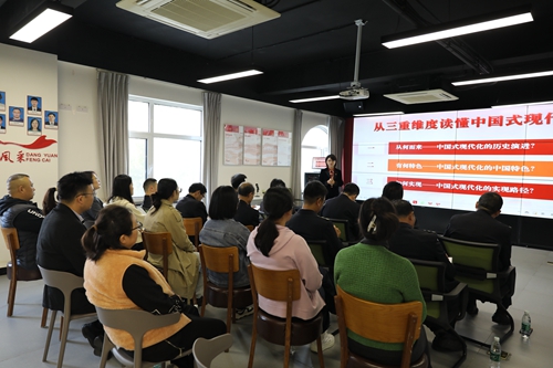 此次活动中,马克思主义学院“习声回响”理论宣讲团教师王敏以“从三个维度读懂中国式现代化”为题,向省海洋渔业执法局党员、城发集团党员及社区工作人员开展宣讲,赢得了听众的高度肯定和好评。下一步,马克思主义学院党总支将以此次党建共建为契机,不断丰富共建形式和内容,将党建育人、思政课教学、服务社区等深度融合,切实将党建共建的优势转化为立德树人、服务群众的实际成效。