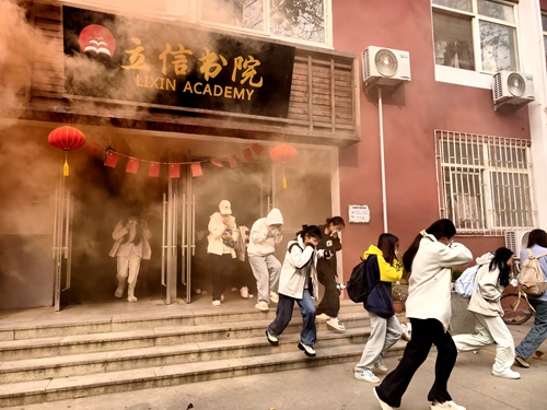 演练过程中,各公寓分别模拟4层出现火情。接到火情报告,公寓管理员迅速到达起火现场,查看火情、扑灭初火,火势较大,立即启动应急消防程序,拨打火警电话,拉响警报,有序组织公寓内学生疏散。公寓内,学生用湿毛巾掩住口鼻,在公寓管理员和楼管会学生干部的指挥下,按照消防演练预案快速有序通过消防通道和消防逃生窗,到达指定地点集结,舍长、层长迅速清点人数向管理员汇报,各公寓管理员对楼内逃生演练进行了讲评和公寓安全须知宣讲,整个演练过程紧张有序、安全快速。
