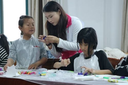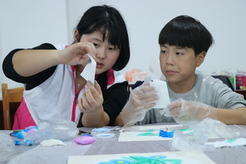 宣讲前,团队成员结合学习资料包与网络资料认真总结提炼宣讲内容,根据此次面向的宣讲群体认真准备讲解资料,精心制作宣讲PPT与鉴赏画作,以“花鸟篇”为切入,深入浅出地讲解了传统花鸟画的多样性、历史脉络、文化寓意以及在不同历史时期的发展演变。宣讲过程中,宣讲队成员采取多样化的宣讲与互动形式,让小朋友们领略古代传统花鸟画的艺术巧思和文化魅力。宣讲团队还结合专业特色寓教于乐,在宣讲活动中增加小朋友们对花鸟画的认识了解和体验,带领大家进行创意花鸟画手作体验。在志愿者的指导下,小朋友们制作出一朵朵惟妙惟肖的立体渲染花朵点缀在画作上,创作出一幅幅独一无二、意境美妙的“花鸟画”。通过趣味而有意义的学习,在社区少年儿童心中播下了一颗文化自信的种子,打开了对传统文化好奇的心扉,激发了对传统文化的热爱与探索。