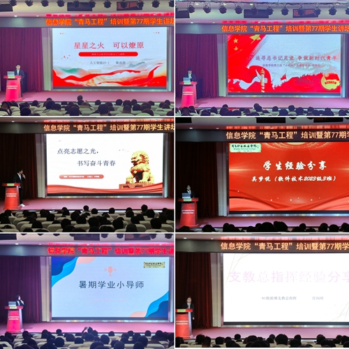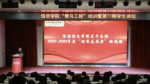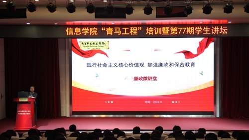 11月24日,信息学院组织开展“青马工程”培训暨第77期学生讲坛,信息学院党总支书记李明杰、团总支书记罗卫朋、“青马工程”学员及2024级学生共400余人参加了此次活动。