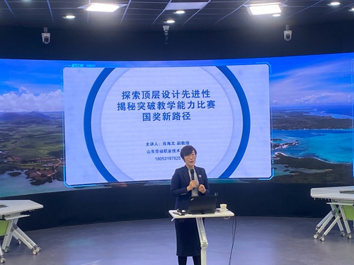 培训过程中,肖海文以《探索顶层设计先进性,揭秘突破教学能力比赛国奖新路径》为题,以近两年国家级教学能力大赛获奖作品为例,从特色主线先进性的课程设计思路与方法、产业前沿与数字转型的课程重构、引领性与时代性并存的项目选题思路及环环相扣逻辑清晰的教学实施报告等方面对教学能力比赛进行了详细的讲解。
