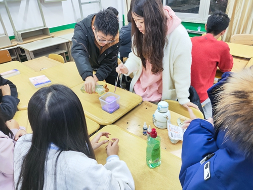 活动中,社团成员讲解了火山喷发的原理,并分组用小苏打、洗洁精、白醋等混合模拟火山喷发实验,通过实践操作让学生们近距离感受科学实验的魅力,激发了探索未知、勇于实践的科学精神。此外,社团成员通过科普介绍了目前面临的自然灾害的类型和相关案例,让学生们学会了在灾害发生时如何应对危险并安全逃生,筑牢生命安全意识。