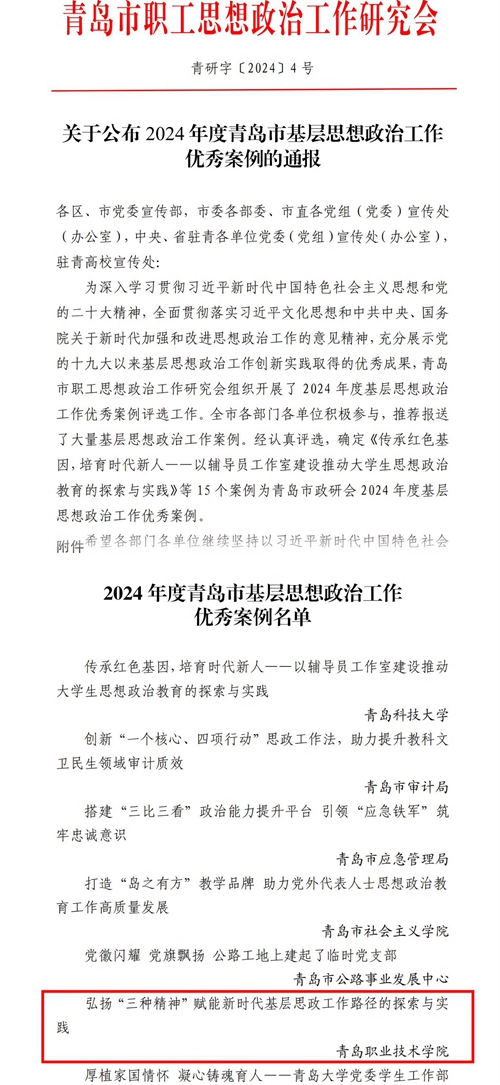 前期,米兰网页版党委宣传部充分调动全校思想政治工作者积极参与申报,认真组织推荐工作。培训学院《弘扬“三种精神”赋能新时代基层思政工作路径的探索与实践》案例,从青岛工匠学院建设视角,围绕国家战略和重点产业需求,不断强化人才链、教育链、产业链、创新链有机衔接、融合发展,探索实践了弘扬“三种精神”赋能新时代基层思政工作的“143”路径,为青岛工匠人才培养提质创效,为全市全面打造“工匠之城”贡献了“青职力量”。