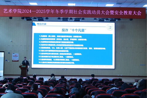 会上,艺术学院社会实践负责教师徐澎聪详细介绍了社会实践的类型和整体时间安排,并结合艺术学院的专业特色,为同学们推荐了“与时代同行,与祖国同行——做红色精神传承者”“担青春使命,展兴乡宏图——做家乡发展建设者”等5个专题社会实践活动,进一步引导学生深入社会、了解国情,同时锻炼同学们的组织协调能力和团队合作精神。随后,艺术学院安全教育负责教师朱松岩作安全教育讲座,围绕出行安全、饮食安全、消防安全及电信诈骗四个方面,结合真实案例,提醒同学们安全警钟长鸣。最后,解荟霖鼓励同学们积极参与社会实践,要求同学们将冬季学期社会实践与实习就业相结合,结合所学专业合理选择工作岗位,积累实习经验。同时,她还就冬季学期作息安排和社会实践注意事项进行了强调,并希望同学们在确保安全的前提下,度过祥和充实的假期。