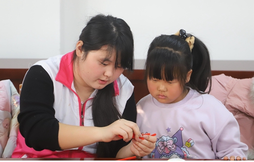 志愿者耐心指导小朋友制作扭扭棒鞭炮