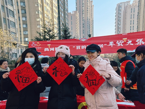 活动现场,来自西海岸新区的书法爱好者们挥毫泼墨,书写祝福,围观的群众也加入到书法艺术体验中,弘扬传统书法、传承优秀文化,树立学习新风尚,在文化体悟中表达了对春节的美好期望。在“我的好邻居”年货大集活动中,“青旅红”志愿者为现场的社区居民送上“文旅”年货——派送福贴和春联祝福,同时向群众宣讲推广“学习强国”学习平台文化栏目,指导他们下载、注册“学习强国”APP,并详细介绍其栏目及功能,为居民群众发放“学习强国”学习平台文创产品,让参与人员更好地利用“学习强国”学习平台了解全国各地的春节习俗。