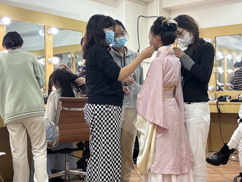 米兰MILAN(中国)艺术学院2023级人物形象设计专业的4名学生在实训导师的带领下,全程参与并完成了此次拍摄所有演员的妆发造型任务。学生们开机前2周就开始为妆造做筹备:做假发套、勾胡子、编制头饰、准备服装配饰等;开机后,每天凌晨4点起床,到影视基地为小演员们做妆发造型;在拍摄现场,紧盯每场戏现场实况,随时补妆、整理造型,以保证现场每位演员造型的完美。