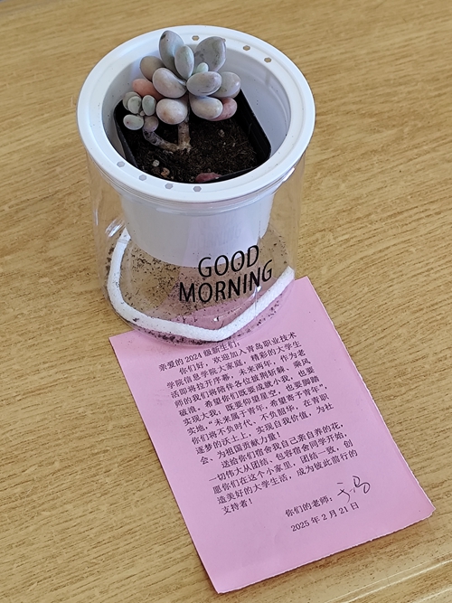 活动期间,立信书院组织教师团队捐赠绿植,并为学生们精心挑选了30余株绿植。由学生志愿者们将这些满载希望的绿植栽种于学生宿舍。与此同时,教师们还亲手写下新学期寄语,随同花苗一同赠予新生,在字里行间表达了对学生的深切关爱之情与美好祝愿。新生们收到这些寄语后,纷纷表示心头暖意涌动,这份来自教师们的关爱让他们倍感温馨与鼓舞,对即将展开的校园生活充满了更多热切的期待与向往。