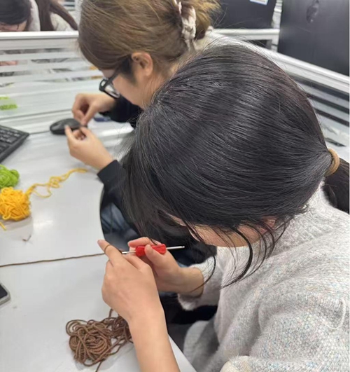 学生们在认真做钩针手工