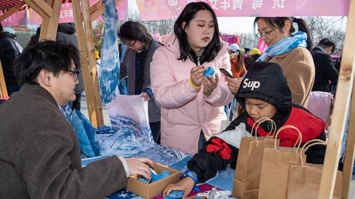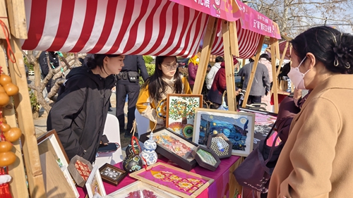 活动现场,师生们以多元的形式为草莓节增光添彩。在文创展示区域,艺术学院艺创工坊制作的非遗绒花、忆·簪花工作室的非遗缠花、布同衣往的蜡染布艺以及衍纸工作室的衍纸手创等琳琅满目的作品,迅速成为现场焦点,吸引了众多群众纷纷驻足。在创意摄影活动中,师生们用镜头定格活动现场的精彩瞬间,为红石崖街道进行宣传,展现了传统文化的魅力与新时代青年的创新精神。