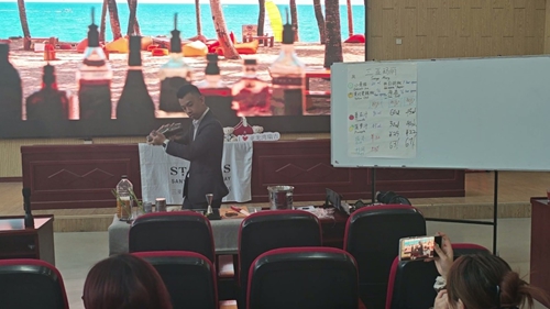 第二阶段是职业经典案例“情景展示”和调酒专业技能展示。刘霞和招聘经理陈雨飞展示的职业情景剧让同学们“沉浸式”体验了对高品质管理与服务的理解;餐厅副经理Dennis展示了三亚瑞吉经典鸡尾酒“三亚玛丽”,美轮美奂的作品诠释着酒店行业的工匠精神和科技无法取代的服务价值。活动通过体验、参与的方式激发了学生们的强烈兴趣和热烈讨论,坚定了职业自信、开启了“职业启航”。