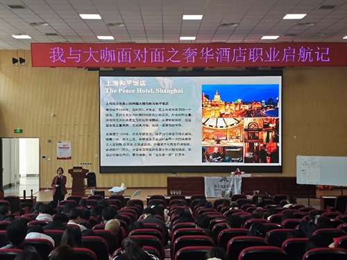 此次活动分为两个阶段,第一阶段是酒店品牌文化与职业成长路径介绍。刘霞介绍了瑞吉酒店品牌历史沿革以及三亚阿斯特庄园的概况;酒店餐饮总监杨厚才介绍了全球知名奢华酒店,并展示了瑞吉酒店的“三步职业梯”人才画像、酒店设施及服务特色、职业晋升机会和发展路径。