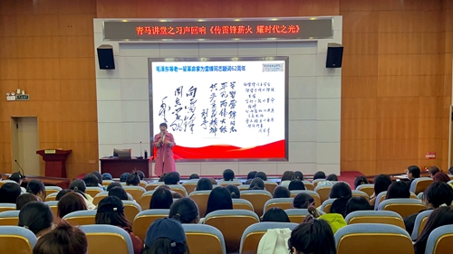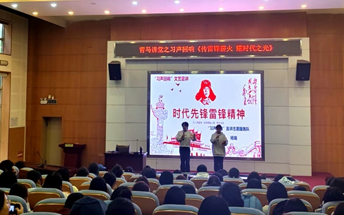 此次宣讲对校园传统讲座方式进行了创新,由马克思主义学院第一党支部书记、《习近平新时代中国特色社会主义思想概论课》教研室主任、“习声回响”志愿服务队队长王芳和来自“习研社”“青马课堂”“匠心匠星”等多个社团的学生共同完成。宣讲会通过“影片赏析”“理论探源”“实践分享”三个环节,穿插“师生对话”“师生同唱”“节目展演”三种形式,深入探讨了雷锋精神的时代价值和对青年学子的启示,让学生在“有理有趣”“走新又走心”的情理艺交融现场,沉浸式学习感悟雷锋精神,激发学生奋发奉献新时代的斗志和信心。
