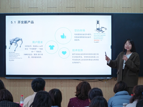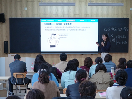 此次活动采取“现场授课+专家点评+全员评分”的形式进行。经抽签确定,首期参赛教师张佳玉、邓丽君分别围绕《基于平台的选品方法》《锚定效应下的定价策略》进行教学展示。张佳玉以亚马逊平台Hertzko、Pet Repulique案例为切入点,帮助学生理解利基市场,掌握数据驱动的决策思维,提升对市场趋势的敏感度。邓丽君创新采用“小组讨论+情境模拟”等互动模式,让学生在实际操作中提升思维能力和问题解决能力。