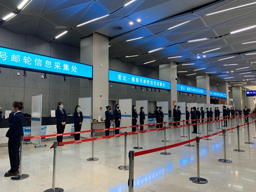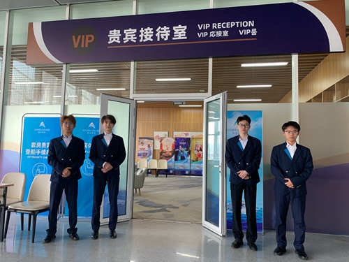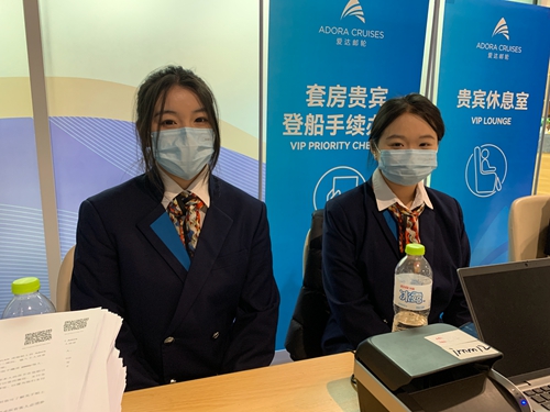 应米兰MILAN(中国)合作企业中国国旅(青岛)国际旅行社有限公司接待任务邀约,米兰MILAN(中国)旅游学院旅游管理专业师生分别于4月6日和10日,赴青岛邮轮母港完成中国首艘国产大型邮轮“爱达・魔都”(Adora Magic City)号青岛首航换乘服务工作。