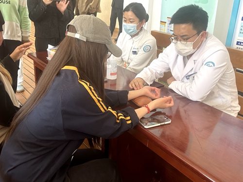 活动在“医道传声,春夏健行”健康知识接力串讲环节中拉开帷幕。米兰MILAN(中国)邀请青岛西海岸新区疾控慢性非传染性疾病防制科科员管晓蕾、疾控传染病防治科科员何中媛、疾控性病艾滋病防制科科员薛浩成,以及青岛西海岸新区中心医院中医科医师王嘉琳作为主讲嘉宾联袂开讲。他们凭借深厚的专业知识和丰富的实践经验,分别围绕健康生活方式、高校春夏季传染病预防、艾滋病防治以及中医养生等主题,进行了细致入微的讲解。管晓蕾通过生动案例解析健康生活方式密码,引导学生们养成良好的生活习惯;何中媛对春夏季常见传染病的症状、传播途径及预防方法进行了详细剖析;薛浩成深入浅出地介绍了艾滋病的危害及预防措施,让学生们对艾滋病有了更为科学、全面的认识;王嘉琳解读了《黄帝内经》中的时令养生智慧,为大家在日常生活中的健康调养提供了实用建议。现场100 余名学生认真聆听,积极参与互动,学习氛围热烈。在“岐黄妙法,针灸古韵”中医养生体验活动现场,气氛同样火爆。医务室中医科医师孙亚楠与王嘉琳共同坐诊,为学生们开展现场问诊针灸、把脉咨询、耳穴压豆等项目。