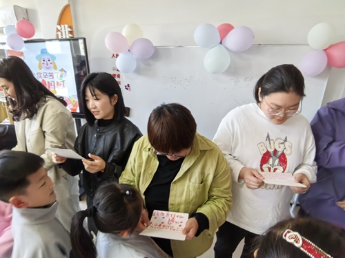 教育学院志愿服务队以一支柔美的舞蹈和美妙的歌声《是妈妈是女儿》拉开序幕,轻盈的舞姿诉说母爱的细腻。随后,小朋友们用俏皮的舞蹈跳出童真童趣,用稚嫩的嗓音朗诵美妙诗篇,表达对母亲深深的爱。“你来比画我来猜”亲子默契大挑战环节将气氛推向高潮,孩子们手舞足蹈地模仿“鸡飞狗跳”“火龙果”等成语文字,家长们秒懂答案,笑声此起彼伏。此外,志愿者还组织社区孩子们给妈妈手绘贺卡,并组织家长和孩子们合唱《世上只有妈妈好》。