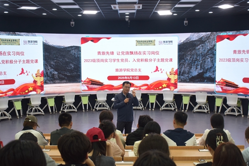 5月13日,为加强顶岗实习学生入党积极分子的教育培养及管理服务,提高党员队伍建设质量,旅游学院党总支副书记王耀辉为2023级入党积极分子讲授题为“青旅先锋——让党旗飘扬在实习岗位”顶岗实习前专题党课。