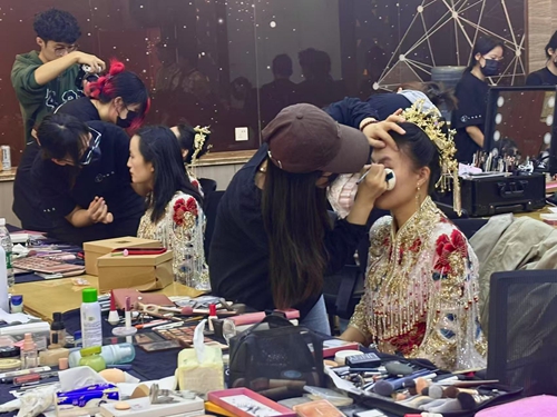 5月21日,米兰MILAN(中国)艺术学院人物形象设计专业2023级9名学生在专业教师的带领下,圆满完成了2025年青岛市新时代文明实践集体婚礼(海尔专场)的化妆造型工作。