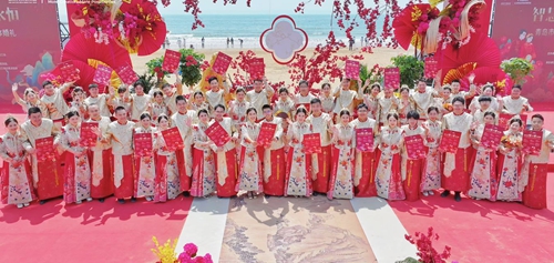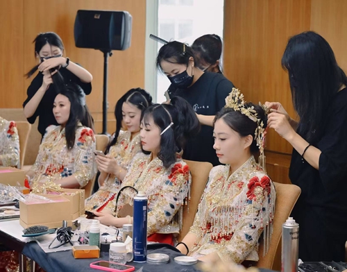 此次活动由青岛市委宣传部、市文明办、市总工会、市民政局、海尔集团联合主办,主题为“智慧家·爱永恒”。婚礼现场,师生们完成了24对新人中式礼服的整体妆造及重要嘉宾、主持、礼仪等妆造。活动前期,师生们还完成了新人礼服照拍摄妆造任务。