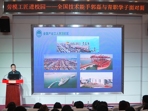 讲座中,郭磊结合丰富的港口工作经验,为在场师生详细解读了集装箱的产生和分类、集装箱船舶的发展、集装箱码头装卸专用机械的种类、集装箱装卸流程以及桥吊安全装卸工艺等内容。现场还播放了现代自动化码头的工作视频,使大家能够更加直观地了解港口物流的实际操作场景。在互动交流环节,郭磊耐心细致地解答了学生们提出的关于行业就业形势和如何提高专业核心竞争力等问题,并以其专业严谨的讲解风格和丰富翔实的案例援引,赢得了现场学生们的热烈掌声。