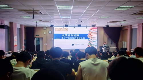 王新艳以“从笨重到轻薄 —— 电子产品发展的奇妙之旅”为主题,采用“问卷+讲授+互动”形式开展讲座。讲座前,通过学情调研掌握学生知识储备与兴趣点,采用“双问卷”方式,优化讲座内容,涵盖电子产品分类体系、智能制造流程、静电防护技术等专业领域。讲座中,王新艳结合教育部最新公布的29个战略性新兴本科专业,深入解读国家科技发展战略对人才需求的影响。她结合丰富的案例,展现了从早期占据整间机房的大型计算机到现代可折叠智能设备的技术创新推动产品形态迭代,深刻改变人类生活方式的发展历程。此外,她还展示了往届学生的技能大赛参赛作品。讲座现场学习氛围浓厚,学生全程专注聆听,互动环节踊跃提问,充分展现信息学子对科技前沿的探索热情。讲座结束后,开展了讲座效果意见征集,为后续系列讲座质量的提升提供了依据。