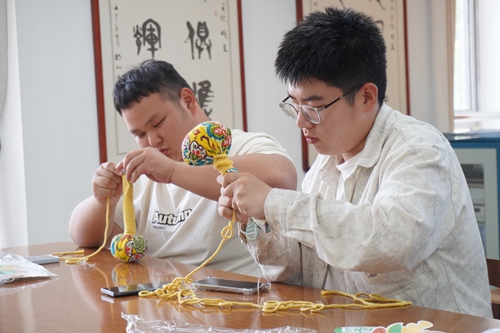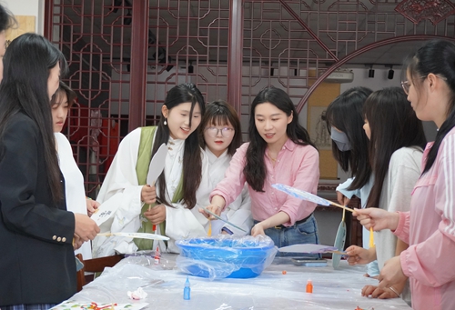 活动现场设置了艾草香囊、手工养生锤、非遗漆扇三个特色体验区域,浓厚的文化氛围让端午文化在指尖变得可触可感。“香囊手作区”艾香四溢,大家穿针引线,把五彩斑斓的布料细心缝合,再填入艾草等香料,配以精美的穗子,一针一线都承载着祈福安康的细腻情感和美好寓意。“养生锤制作区”充满互动气息,同学们挑选合适的布料,将草药填充其中,再用麻绳螺旋缠绕固定,裹成紧实的槌状。大家一边制作,一边交流养生知识,互相敲打养生穴位,体验其中的实用妙趣。“漆扇体验区”最具艺术气息,同学们在素扇上绘制出端午元素,书写诗词雅句,随后运用水拓技法,以漆为笔、以水为墨,在扇面上演绎出千变万化的图案,形成独一无二的纹理,让传统扇面焕发出充满生命力的现代美感。一件件亲手完成的香囊、养生锤、漆扇等,不仅是独特的节日纪念品,更成为承载文化记忆与个人情感的珍贵载体。