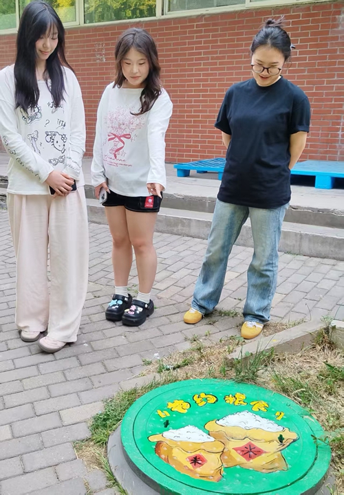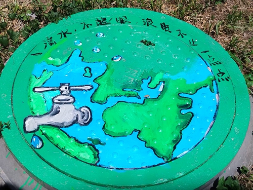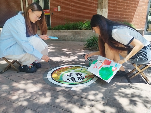 来自艺术学院艺术设计专业的胡智雯和岳艳然两位学生负责绘画,她们用颜料和笔刷通过色彩的渲染调配,以井盖为纸,以笔为媒,紧扣珍惜粮食、节约用水用电等内容,巧设装扮食堂外围井盖,为食堂外围增添了一道亮丽的风景线。这些精心绘制的井盖画,以别样的方式将主题展现于每一位路过师生的眼前,引得大家纷纷驻足观看或拍照,营造了“厉行节约、反对浪费”的浓厚氛围。