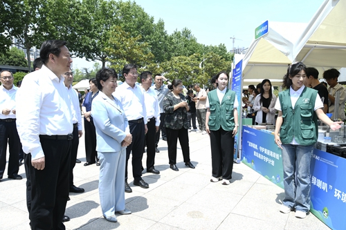 生物与化工学院师生代表认真聆听了市领导关于生态文明建设的讲话,深刻感受到青岛在生态保护与绿色发展中的决心与成就。“绿喇叭”团队在活动现场的生态市集展区,通过精心布置的展台、展架等展示了团队在环保实践中的创新成果,吸引了市领导及众多观众驻足交流。