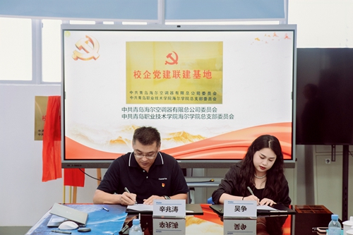 实施党建团建联建共建,共筑红色发展引擎。座谈会上,双方围绕“党建引领、资源共享、优势互补、合作共赢”达成共识,在校企联合培养优秀人才、教师资源共享、党建联建等方面达成初步合作意向。海尔空气产业党群部长、工会主席辛兆涛与杨春旺共同为“校企党建联建基地”揭牌,与吴争签署了校企党建联建协议书。此次联建是推动产教融合的重要举措,期待双方通过在人才培养、技术创新、社会服务、党员发展、入党积极分子接续培养、基层党组织和党员作用发挥等方面的合作,实现党建工作与业务工作的深度融合,以党建促发展,为校企双方的高质量发展提供坚强的政治保障。