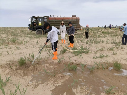 在年均降水量仅120毫米、蒸发量超2000毫米的民勤县,“小胡杨”团队走进防沙治沙纪念馆、节水科技馆等,从历史照片与当代治沙成果的对比中,读懂了从“沙逼人退”到“绿进沙退”的变化,更深刻领悟“确保民勤不成为第二个罗布泊”的生态使命。在民勤县种林公益发展中心公益林,负责人仲麟现场示范了梭梭苗养护技术。在工作人员的指导下,队员们顶着高温完成了挖坑、浇水、覆土等工序,切身感受治沙人的艰辛与不易。