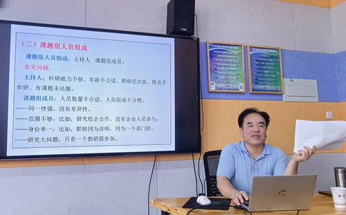 于志云教授多年深耕科研与教学领域,曾多次主持和参与国家级、省部级课题,具有深厚的学术造诣和丰富的课题指导经验。此次讲座围绕“教学改革课题的申报与实施”和“新时代职业教育发展趋势”两大主题展开,系统梳理了课题申报、教学成果奖撰写等过程中的关键环节与常见问题,并结合教师实际需求进行了精准辅导。