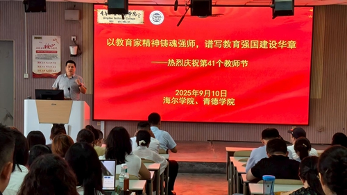 为弘扬尊师重教传统,增强教职工职业使命感、幸福感及荣誉感,9月10日,海尔学院党总支在修能楼201室举行“以教育家精神铸魂强师,谱写教育强国建设华章”主题第41个教师节庆祝活动。海尔学院、青德学院全体教职工以及部分学生代表参与庆祝活动。
