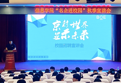 9月11日,信息学院在艺术厅举办“名企进校园”秋季专场宣讲会。活动邀请了青岛京东方光电科技有限公司、青岛海诺鼎信信息技术有限公司和青岛蓝色基点电子商务有限公司等企业进行招聘宣讲。信息学院200余名2026届毕业生参与了此次活动。