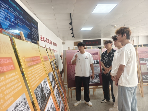 此次活动由信息学院形势与政策授课教师李明杰统筹,课代表李灿、门玉凯组织,全程依托图书馆展览资源,让学生在实践中感悟历史。活动伊始,师生在图书馆前合影,为此次红色宣讲活动拉开序幕。随后,学生分为十组在展览各区域开展宣讲。每组学生提前结合形势与政策课所学知识,梳理抗日战争时期的重要历史事件、英雄人物事迹及中国人民抗日战争的伟大贡献,在展览现场通过讲解图片背景、解读文字史料、分享历史故事等方式,将课堂上的理论知识转化为生动的现场宣讲内容。过程中,不仅宣讲的学生加深了对历史的理解,旁听的同学也通过互动交流,进一步明确了抗日战争胜利的历史意义与时代价值,实现了“以讲促学、以学促思”的效果。