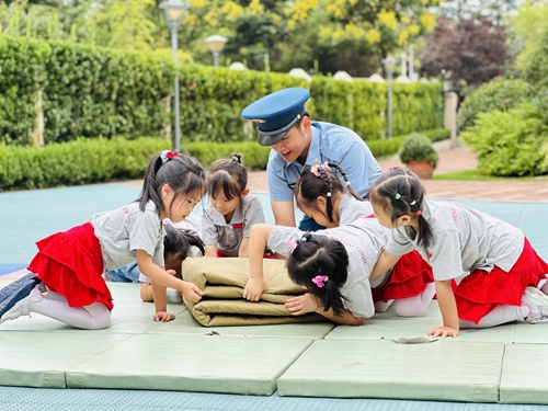 活动中,退役军人与幼儿园孩子们共同完成升旗仪式,并向孩子们讲解国旗的含义,培养孩子们的家国情怀。此外,退役军人还带领孩子们学唱《我和我的祖国》《强军战歌》等经典红歌。在“小小军人体验营”环节,退役军人化身“教官”,为孩子们带来了基础军训体验,从稍息、立正、敬礼等简单动作教起,耐心纠正孩子们的姿势,鼓励他们像军人一样勇敢、坚强;在叠军被环节,退役军人现场展示“豆腐块”军被叠法,并指导小朋友们体验叠军被;在“国防小课堂”,退役军人用生动形象的语言,结合图片、动画等素材,向孩子们介绍祖国的大好河山和先进的国防装备,讲述简单的国防知识和英雄故事。活动现场气氛活跃,孩子们与退役军人积极互动。