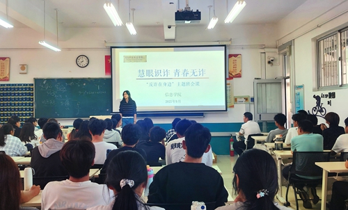 9月29日,信息学院在修能楼301室开展“慧眼识诈 青春无诈”主题班会公开课。此次公开课由信息学院辅导员陈琳主讲。20余名辅导员,2025级160余名新生参加了主题班会。