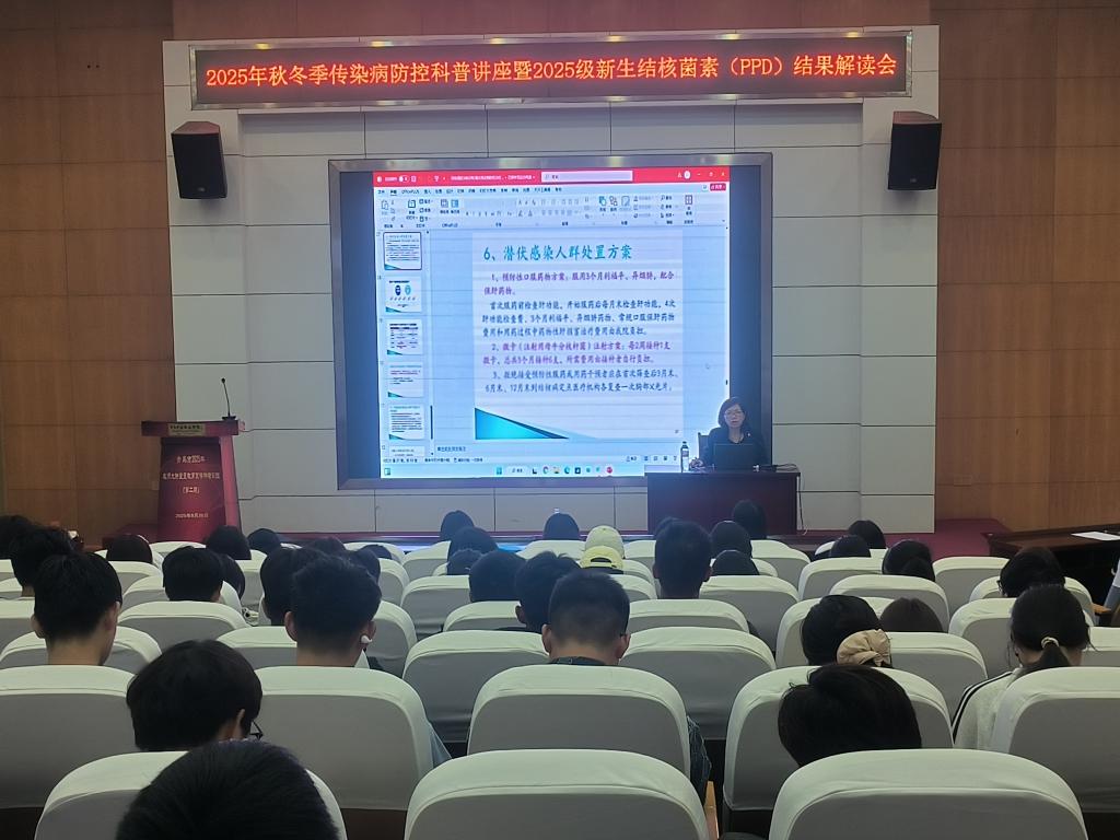 讲座中,三位专家结合自身专业领域与丰富实践经验,为师生带来了一场内容翔实、通俗易懂的科普盛宴。徐燕就2025级新生PPD筛查结果进行专题解读,针对强阳性筛查结果给出了具体的后续处理建议,重点强调强阳性学生需及时进行胸片等进一步检查。薛云鹏作“共抗艾滋,共享健康”专题宣讲,清晰介绍了艾滋病的传播途径、典型症状及严重危害,重点澄清了“日常接触会传染艾滋病”等常见认知误区,着重强调了早检测、早干预对艾滋病防治的重要意义,引导师生树立正确的健康观念。李一凡医师围绕“高校秋冬季传染病健康知识宣讲”主题,系统梳理了流感、诺如病毒感染性腹泻、水痘等秋冬季常见传染病的流行特点与传播途径,为米兰网页版秋冬季传染病防控工作提供了专业指导。