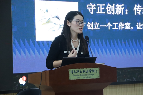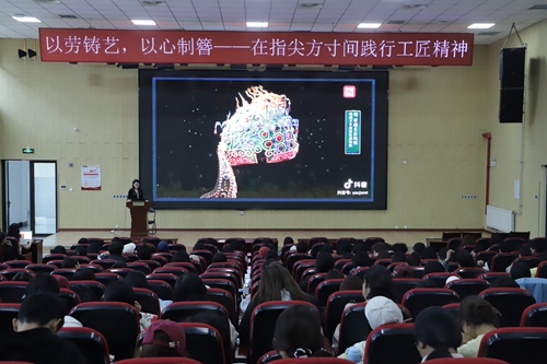 李晓伟从“工匠精神的内涵与当代价值”出发,指出工匠精神是一种对技艺精益求精、对作品极致专注的职业态度。随后,她引领大家步入制簪技艺的历史传承与文化长廊,以一枚枚精美的发簪为载体,生动讲述背后所承载的千年服饰文化、礼仪制度与审美变迁。在“当代匠人践行工匠精神的实践案例”板块中,她深情分享了与制簪技艺结缘的心路历程,并以其创立的忆·簪花工作室为例,展示了师生将传统制簪技艺与现代设计理念相融合的生动实践。最后,她聚焦“工匠精神对文化传承与职业生涯的启示”,紧密结合专业特性,引导学生们在未来职业生涯中要树立“以劳铸艺、深耕技艺”的职业标杆,在指尖的方寸之间锤炼真本领,将文化的基因注入当代设计,成为既有扎实技艺又有文化灵魂的优秀设计人才。