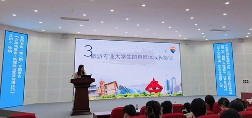 张娟围绕“金牌导游的自媒体探索”“文旅博主的内容创作与运营之道”“大学生的自媒体成长路径”等方面,分享了自己从“自媒体小白”到成为拥有380万粉丝的旅游自媒体“大咖”的经历,再现了一名文旅从业人员在新业态转型过程中,坚持学习、突破自我、把握机遇、“破茧成蝶”的职业历程。互动交流环节,师生代表围绕“文旅产业新业态”“新媒体运营与文旅专业发展”等问题积极提问。张娟结合个人职业成长发展之路以及自己的旅游背景分享了创业的经历,逐一进行了耐心、细致解答,为师生打开了旅游新媒体领域的新视野,现场互动热烈,掌声不断。