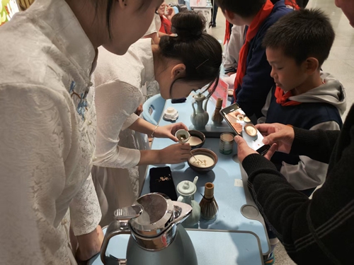 活动现场,茶之雅文化社学生以专业茶艺表演拉开序幕。从温杯洁具的细致、置茶投茶的精准,到注水冲泡的讲究、奉茶礼敬的庄重,一系列规范流畅的动作,将茶艺的优雅韵味与“礼”的文化内涵融为一体,让在场的大中小学生与家长直观感受中华茶文化的深厚底蕴。表演结束后,社团成员化身“思政实践小导师”,分区域开展沉浸式互动体验。有的带领中小学生与家长共同完成重阳主题手工创作,在裁剪、粘贴的协作中传递节日祝福,涵养亲情与协作意识;有的展示宋代点茶技艺,从碾茶、罗茶的古法传承,到调膏、击拂的动手实践,耐心讲解每一步背后的历史文化与工匠精神,让参与者在亲手打出绵密茶汤的过程中,沉浸式触摸中华优秀传统文化的魅力。